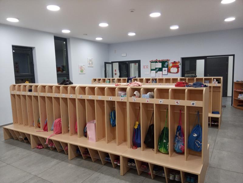 W przestronnej szatni każdy przedszkolak ma swoją półeczkę, tam również prezentowane są wytwory dziecięcej pracy - rysunki, malowidła i inne.